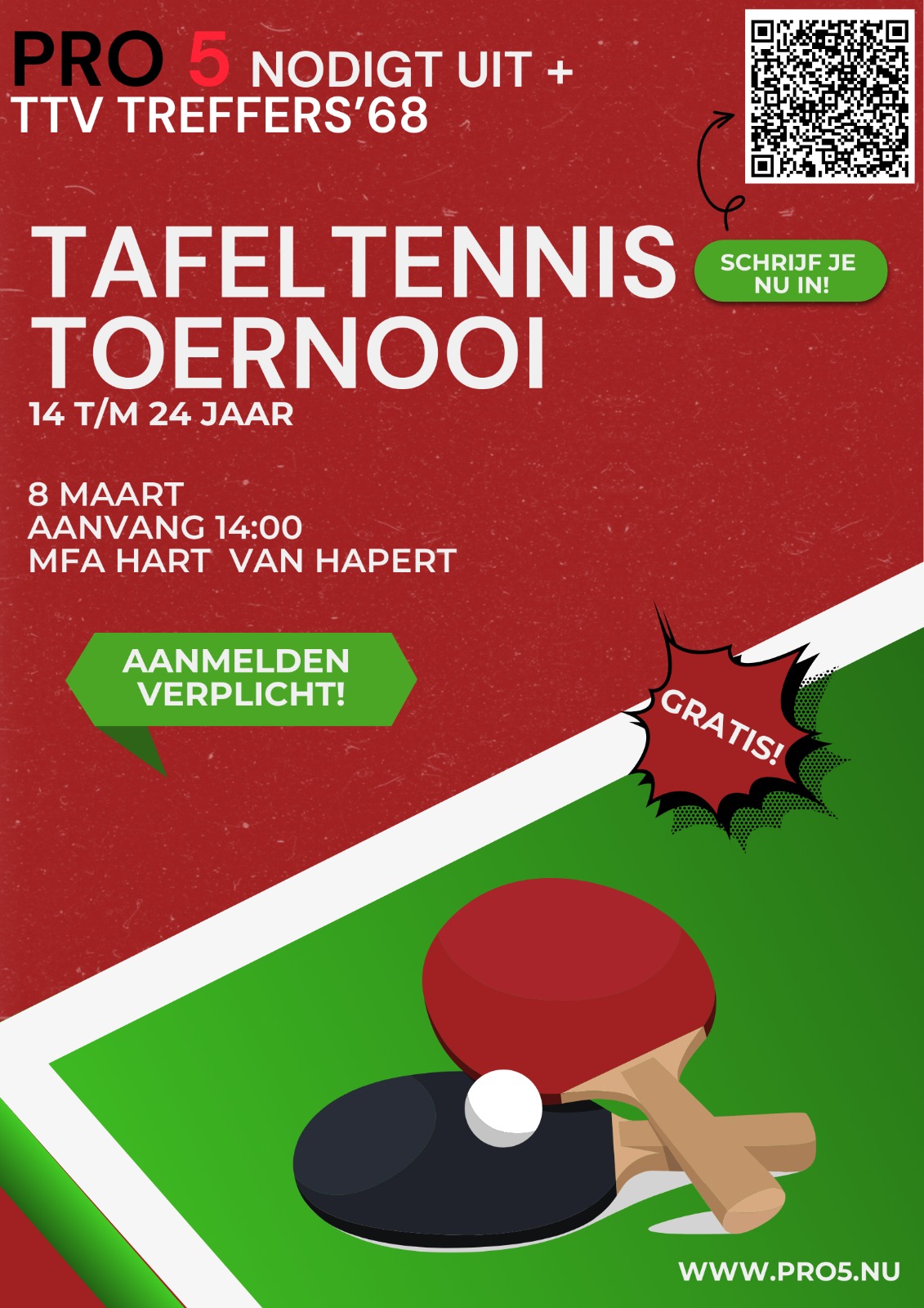 PRO5 nodigt uit. In het kader van verbinding willen wij een breed gebruik van onze gemeenschsapshuizen propageren. Voor jong en oud. Daarom organiseren wij een Tafeltennistoernooi voor jongeren van 14 tot 24 jaar. 8 maart vanaf 14.00 uur. Tweede verdieping van MFA Hapert. Doe gezellig mee en meld je ven aan. Dat aanmelden kan via www.pro5.nu