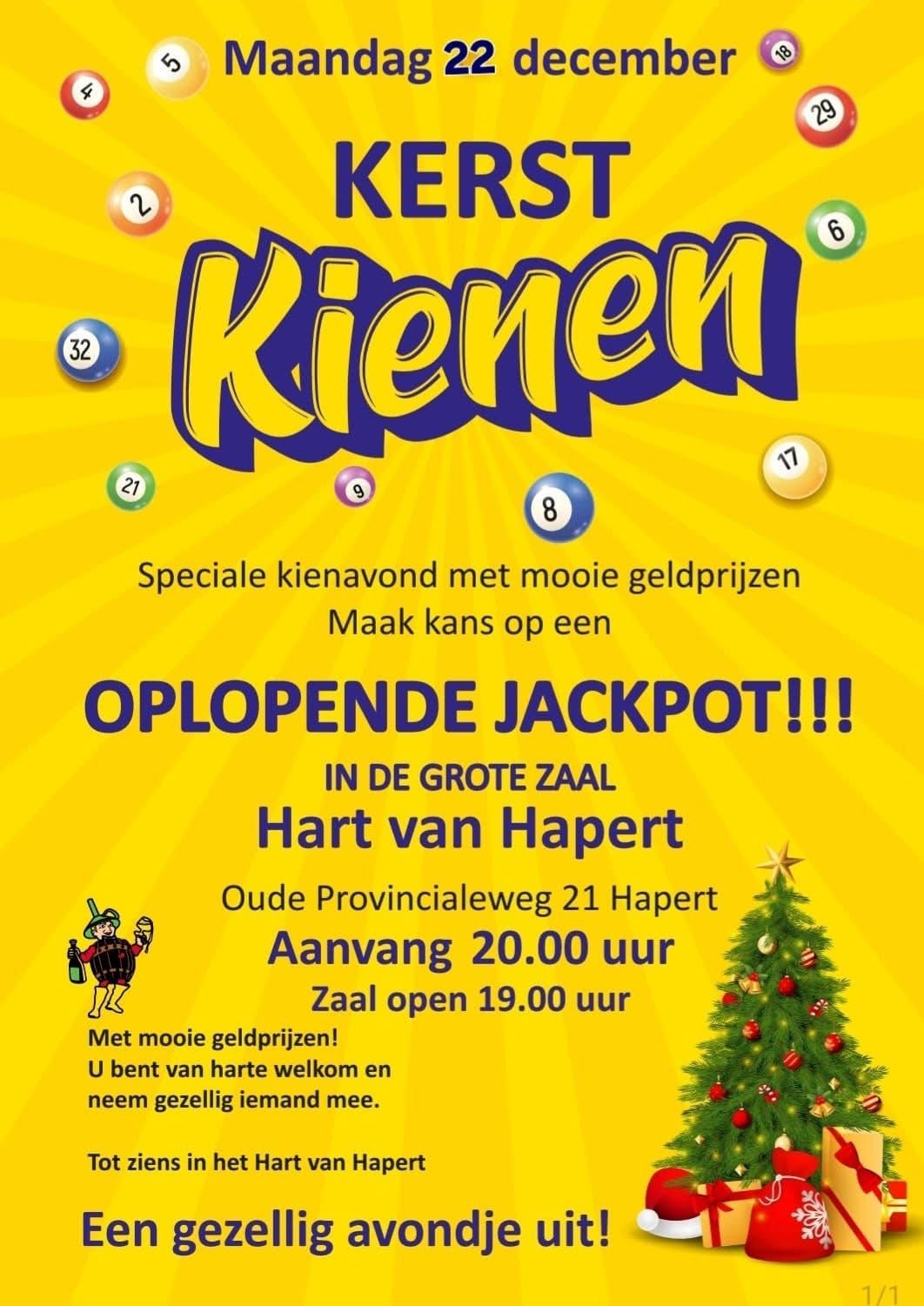 Het kerstkienen is weer in de grote zaal. Op deze avond zal het kienen wel wat langer duren dan normaal, houdt hier rekening mee.